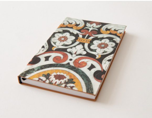 Notebook, size A6, Linha Mármores (LM), decoration in colored and cut marbles, made from an intricate and complex design.