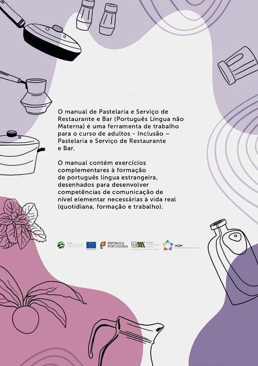 The manual of Portuguese as a Non-Native Language – Pastry and Restaurant and Bar Service is intended for adult migrant or refugee citizens from countries on other continents who are attending the Inclusion course – Pastry and Restaurant and Bar Service.
