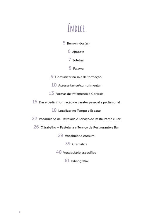 Thus, the manual is designed to guide the process of constructing explicit and conscious grammatical representations and the acquisition of vocabulary and expressions from everyday life and the professional area of Pastry and Restaurant and Bar Service in an integrated manner. It aims to provide a working tool that allows the learner to communicate at an elementary level in various situations (everyday life, training, and work), developing skills in listening comprehension, oral production, oral interaction, reading comprehension, and writing.