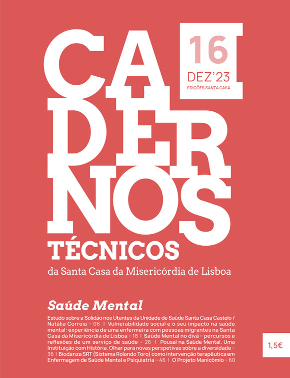 Estudo sobre a Solidão nos Utentes da Unidade de Saúde Santa Casa Castelo / Natália Correia – 06 | Vulnerabilidade social e o seu impacto na saúde mental: experiência de uma enfermeira com pessoas migrantes na Santa Casa da Misericórdia de Lisboa – 18 | Saúde Mental no divã – percursos e reflexões de um serviço de saúde – 26 | Pousal na Saúde Mental. Uma Instituição com História. Olhar para novas perspetivas sobre a diversidade – 36 | Biodanza SRT (Sistema Rolando Toro) como intervenção terapêutica em Enfermagem de Saúde Mental e Psiquiatria – 46 | O Projeto Manicómio – 60
